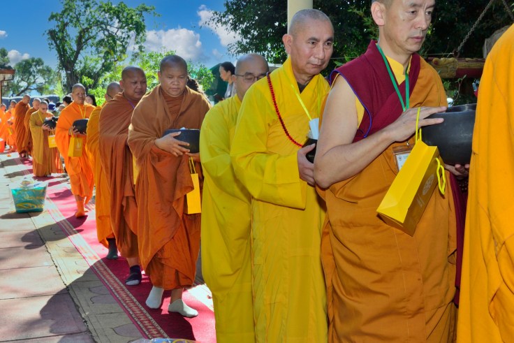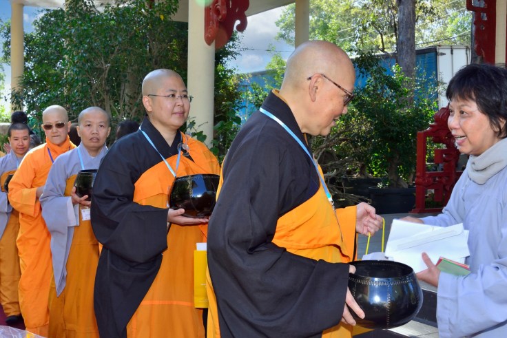 The morning alms round was held between10am-11am. All lay Buddhist practitioners and non-Buddhists had the chance to accumulate merit by offering dried food to the sangha community of over 100 monks and nuns. From 11am-12pm the lunch offering to the sangha community and lunch for all in attendance was held. There were many delicious vegetarian food stalls provided by kind hearted sponsors for everyone to enjoy.