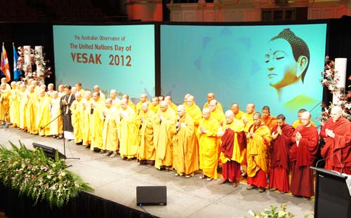 The chanting by a hundred monks and nuns from all Buddhist traditions on the stage made the atmosphere in Sydney Town Hall so sacred. The City of Sydney is a major sponsor of this celebration. Councillor Robert Kok, represented the Council to welcome all participants. Followed by the delivering of Vesak messages from the United Nation, the Prime Minister of Australia, the Opposition Leader, the Premier of NSW and the representative of the Green Party.