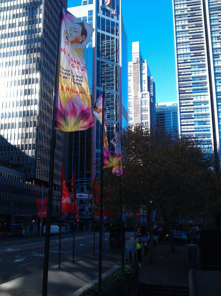 On Sunday May 27th, thousands of Buddhists headed to Sydney Town Hall for the special annual UN Day of Vesak celebration. The Vesak Day has been recognised by the United Nation since December 1999. The Vesak flags flying on the post in front of Town Hall and also decorated at the entrance, made the passing public and traffic in the city aware of the event held in the Hall. Flows of people started to come in the exhibition room almost 2 hours before the official opening of the celebration.